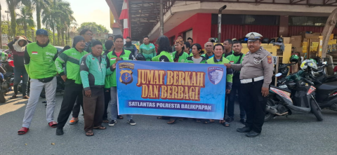 Sebanyak 50 pengemudi ojol tampak antre untuk menerima bantuan berupa beras 5 kilogram yang dibagikan dalam rangka program Jumat Berkah. Bantuan tersebut diserahkan langsung oleh Kapolresta Balikpapan.